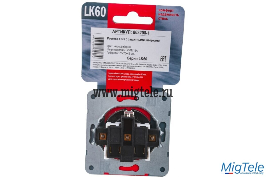Описание Ecoplast 863208-1 розетка с з/к, со шторками LK60