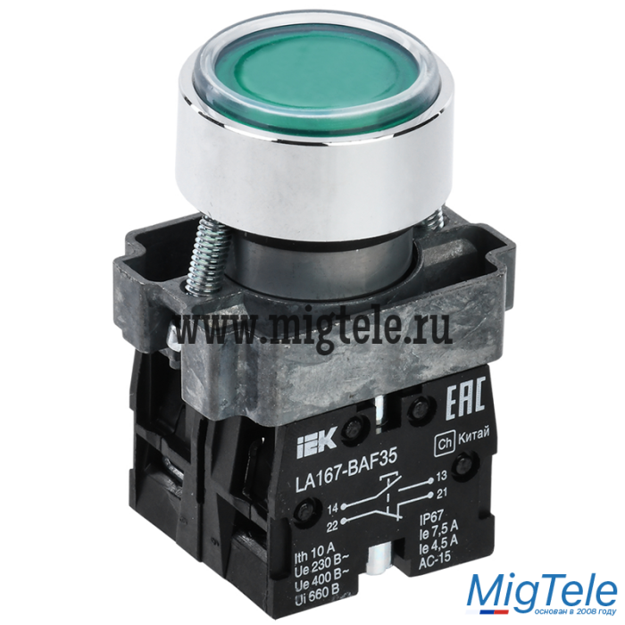 Кнопка LA167-BAF35 d=22мм 1з+1р зеленая IEK |