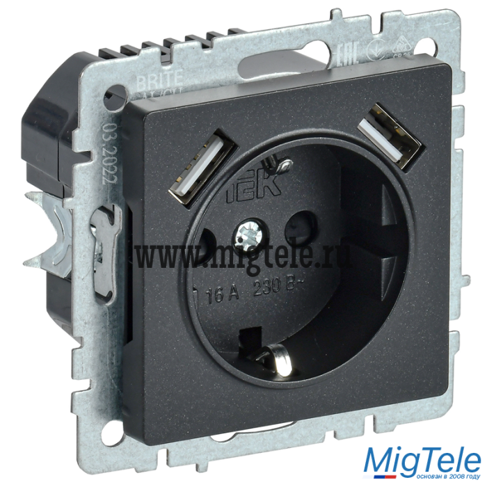 BRITE Роз. с з/к/ш 16А с USB A+A 3,1А РЮш10-2-БрЧ черн. IEK |