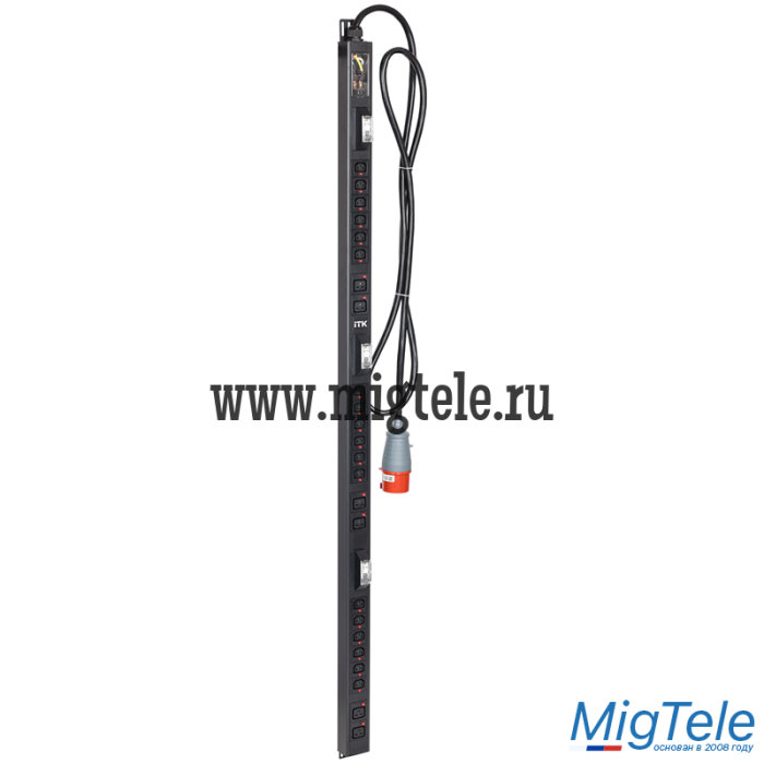 Вертикальный комбинированный блок распределения питания PDU ITK включает в себя розетки двух типов: 18 розеток C13 и 6 розеток C19 что позволяет подключать с их помощью различное оборудование. PDU ITK изготавливается из высококачественных термостойких материалов и пластмасс, оснащается 3-х метровым кабелем электропитания с вилкой промышленного назначения IEC60309. PDU ITK прекрасно справляется с задачей по электроснабжению сетевого оборудования в шкафах и стойках, а также с требованием защиты от токов короткого замыкания и перенапряжения. PDU ITK соответствует российским и международным стандартам качества и устанавливается с помощью кронштейнов, при этом положение кронштейнов можно менять, либо безынструментальным методом при помощи монтажных штифтов.