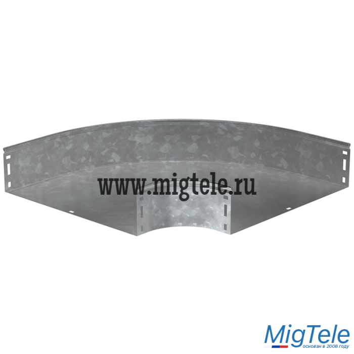 Поворот на 90° плавный предназначен для организации горизонтального поворота кабельной трассы на 90°. Крышка аксессуара в комплект не входит. Аксессуар изготовлен из стали с цинковым покрытием, нанесенным погружением изделий в расплав цинка (защитный слой цинка не менее 55 мкм).