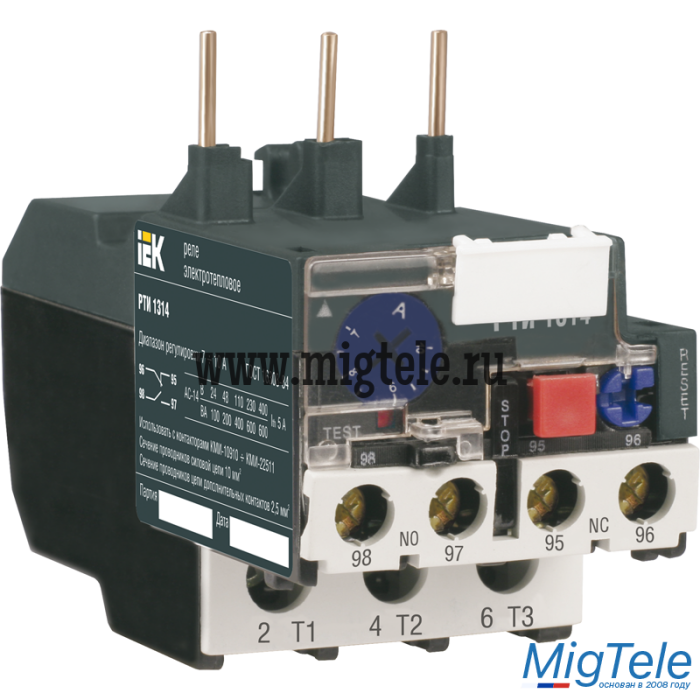 Реле электротепловое серии РТИ является электрическим коммутационным устройством, имеющим собственное потребление энергии. Электротепловое реле серии РТИ предназначено для защиты электродвигателей от перегрузки, асимметрии фаз, затянутого пуска и заклинивания ротора. Устанавливается непосредственно на контакторах серии КМИ. Для защиты от короткого замыкания должны быть предусмотрены предохранители или автоматические выключатели на соответствующее значение номинального тока срабатывания.