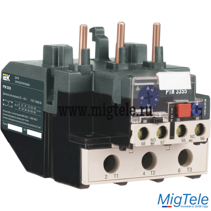 Реле электротепловое серии РТИ является электрическим коммутационным устройством, имеющим собственное потребление энергии. Электротепловое реле серии РТИ предназначено для защиты электродвигателей от перегрузки, асимметрии фаз, затянутого пуска и заклинивания ротора. Устанавливается непосредственно на контакторах серии КМИ. Для защиты от короткого замыкания должны быть предусмотрены предохранители или автоматические выключатели на соответствующее значение номинального тока срабатывания.