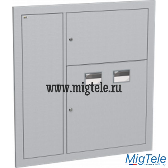 Сварной металлический корпус состоит из трех отсеков: вводно-учетного, распределительного, отсека слаботочного оборудования (расположен слева). В вводно-учетном и распределительном отсеках размещены DIN-рейки для крепления счетчиков (по количеству квартир). В распределительном отсеке установлены DIN-рейки для аппаратов групповых линий и рейка для установки шин N и РЕ. Отсек укомплектован оперативной панелью. Отсек слаботочного оборудования снабжен перфорированными профилями для прокладки теле- и радиосетей, телефонных линий, сетей охранной сигнализации, домофонов и т.п. Для обеспечения пожарной безопасности между слаботочным и силовым отсеками расположена разделительная перегородка.