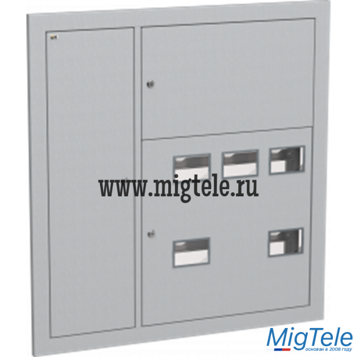 Сварной металлический корпус состоит из трех отсеков: вводно-учетного, распределительного, отсека слаботочного оборудования (расположен слева). В вводно-учетном и распределительном отсеках размещены DIN-рейки для крепления счетчиков (по количеству квартир). В распределительном отсеке установлены DIN-рейки для аппаратов групповых линий и рейка для установки шин N и РЕ. Отсек укомплектован оперативной панелью. Отсек слаботочного оборудования снабжен перфорированными профилями для прокладки теле- и радиосетей, телефонных линий, сетей охранной сигнализации, домофонов и т.п. Для обеспечения пожарной безопасности между слаботочным и силовым отсеками расположена разделительная перегородка.