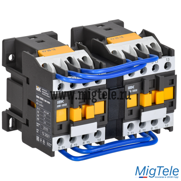 Контакторы КМИ (реверс) IEK используются для пуска, остановки и реверсирования асинхронных электродвигателей, а также для дистанционного управления цепями освещения, нагревательными цепями и различными малоиндуктивными нагрузками (категория применения АС-1). Поставляются с заводскими шинами и механической блокировкой.