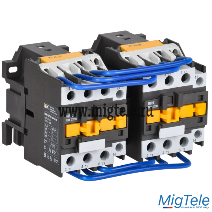 Контакторы КМИ (реверс) IEK используются для пуска, остановки и реверсирования асинхронных электродвигателей, а также для дистанционного управления цепями освещения, нагревательными цепями и различными малоиндуктивными нагрузками (категория применения АС-1). Поставляются с заводскими шинами и механической блокировкой.