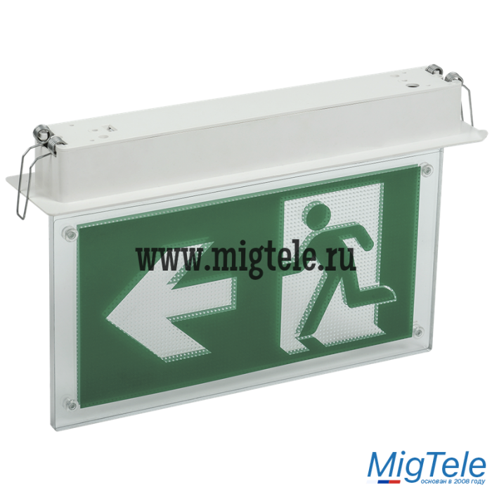 Предназначен для указания путей эвакуации, мест выхода, направления движения и прочих информационных целей в общественных и административных помещениях с низким уровнем содержания пыли и влаги. Знаки сменные. Встраивается в потолки типа Армстронг.