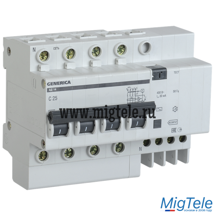 Диф. автомат АД14 4Р 16А 30мА GENERICA |