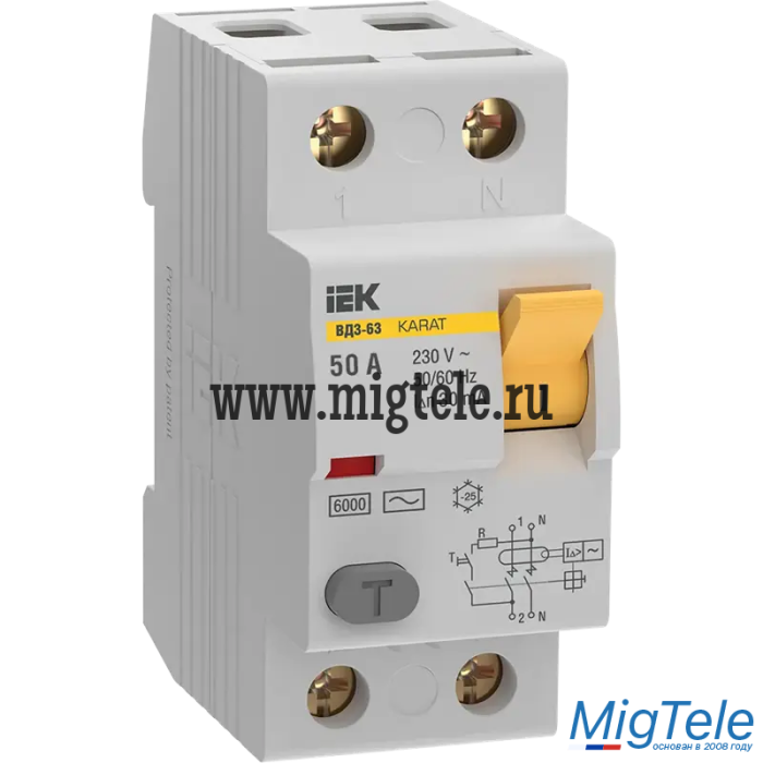Описание IEK MDV20-2-050-030 УЗО KARAT ВД3-63 2P 50А 30мА 6кА