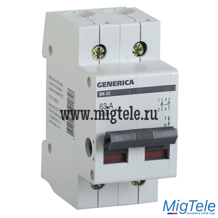 Выключатель нагрузки (мини-рубильник) ВН-32 2Р 63А GENERICA |