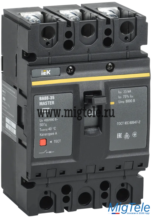 Автоматический выключатель в литом корпусе ВА88 MASTER предназначен для защиты электрических сетей от токов короткого замыкания, токов перегрузки, недопустимых снижений напряжения, а также для проведения тока в нормальном режиме. Автоматические выключатели производятся в 5 типоразмерах, оснащены термомагнитным расцепителем на токи от 16 до 800А и электронным расцепителем на токи от 125 до 800А. Рабочее напряжение 400/690 В. Конструкция автоматического выключателя предусматривает возможность самостоятельной установки дополнительных устройств на объекте заказчика.