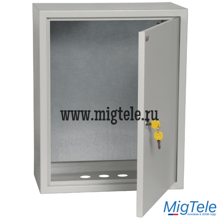 Сварной металлический корпус со съемной монтажной панелью. Дверца корпуса запирается на замок. Ключ замка имеет единый секрет.