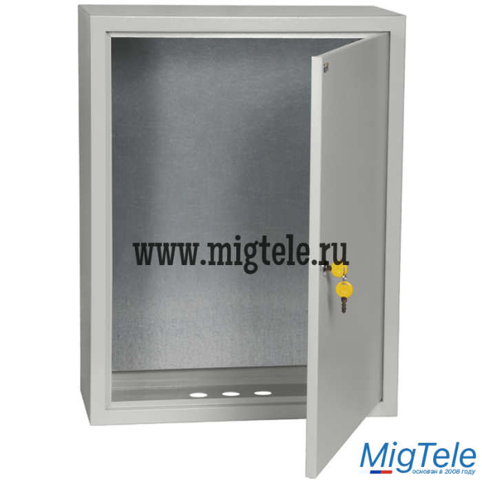 Сварной металлический корпус со съемной монтажной панелью. Дверца корпуса запирается на замок. Ключ замка имеет единый секрет.