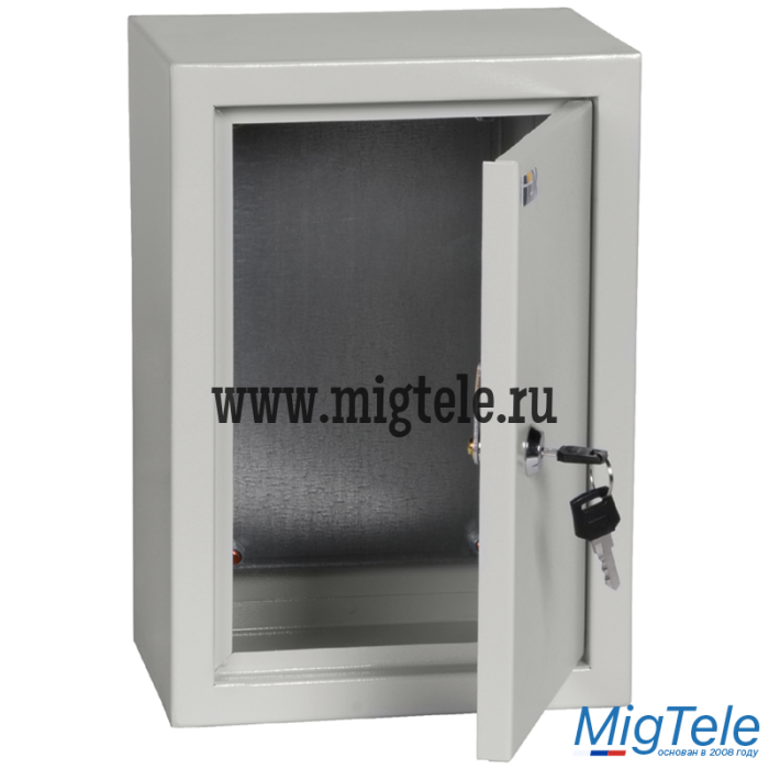 Сварной металлический корпус со съемной монтажной панелью. Дверца корпуса запирается на замок. Ключ замка имеет единый секрет.