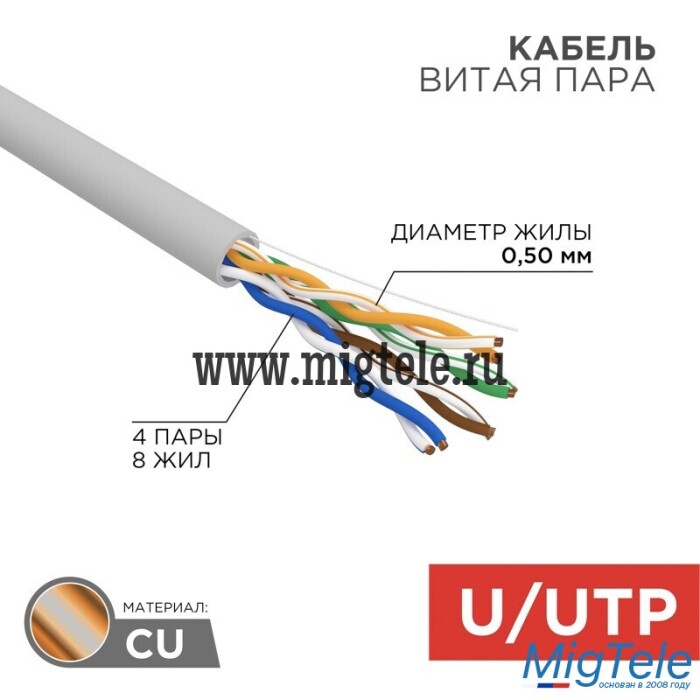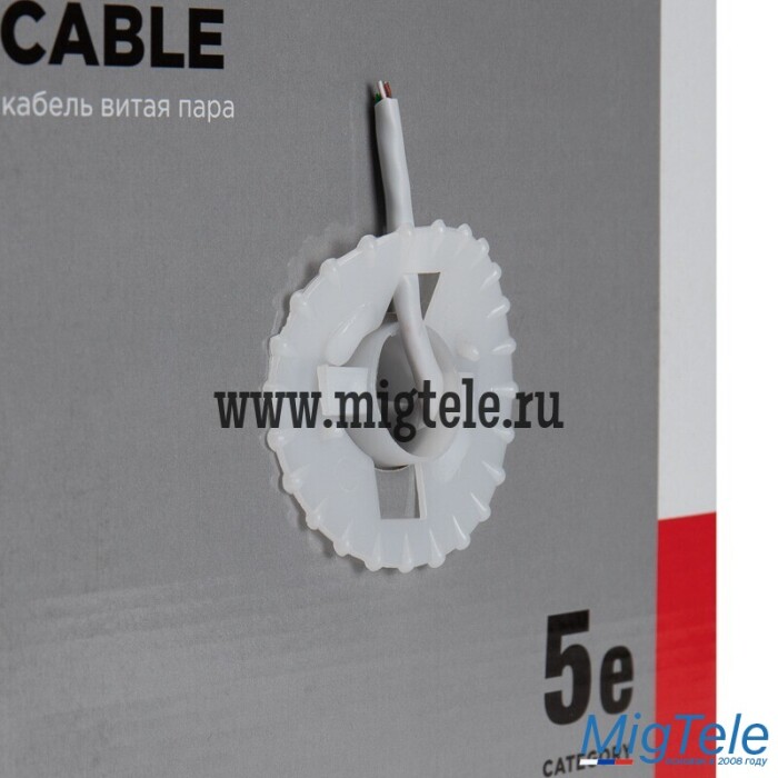 Кабель UTP 4PR 24AWG, CAT5e (бухта 305 м) REXANT. Неэкранированная витая пара, материал проводника – высокоочищенная бескислородная медь, калибр (24 AWG). Материал оболочки – ПВХ (PVC). Кабель соединяет и передает сигнал между компьютерами, компьютерами и сервером. Предназначен для локальных сетей общего назначения, домашних сетей, сетей малого бизнеса, телефонии, цифрового телевидения, компьютерных сетей, систем видеонаблюдения и систем охраны и контроля доступа. Высокая скорость передачи данных достигается за счет специального метода обжима кабеля. Соответствует требованиям стандарта ANSI/TIA/EIA-568-B.2 и международному стандарту ISO/IEC 11801 в редакции 2002 года (издание 2).