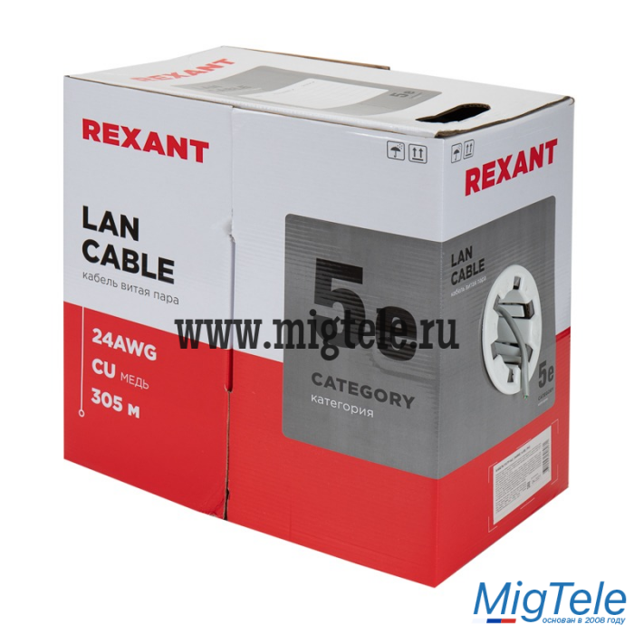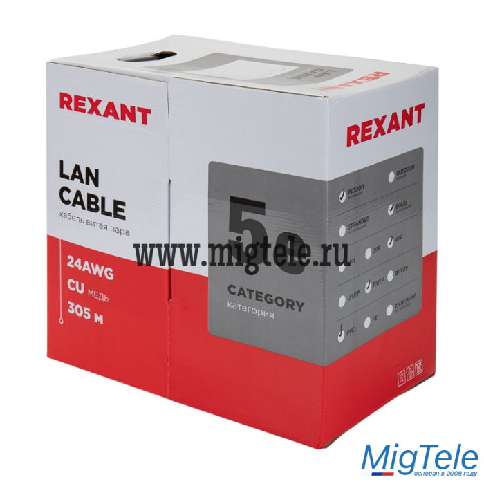 Кабель FTP 4PR 24AWG, CAT5e (бухта 305 м) REXANT. Неэкранированная витая пара, материал проводника – высокоочищенная бескислородная медь, калибр (24 AWG). Материал оболочки – ПВХ (PVC). Кабель соединяет и передает сигнал между компьютерами, компьютерами и сервером. Предназначен для локальных сетей общего назначения, домашних сетей, сетей малого бизнеса, телефонии, цифрового телевидения, компьютерных сетей, систем видеонаблюдения и систем охраны и контроля доступа. Высокая скорость передачи данных достигается за счет специального метода обжима кабеля. Соответствует требованиям стандарта ANSI/TIA/EIA-568-B.2 и международному стандарту ISO/IEC 11801 в редакции 2002 года (издание 2).