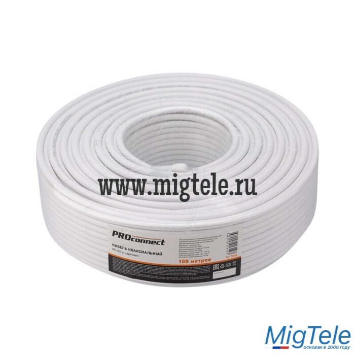 Кабель RG-6U (75 Ом), CCS/Al/Al 48%, бухта длиной 100 м, PROconnect коаксиальный радиочастотный (антенный, телевизионный) со вспененной полиэтиленовой изоляцией в ПВХ-оболочке. Является самым распространенным решением для подключения внутренних и межблочных соединений общепромышленных и бытовых радиотехнических устройств, для подключения систем телевидения, а также для подключения видеокамер наружного и внутреннего наблюдения.