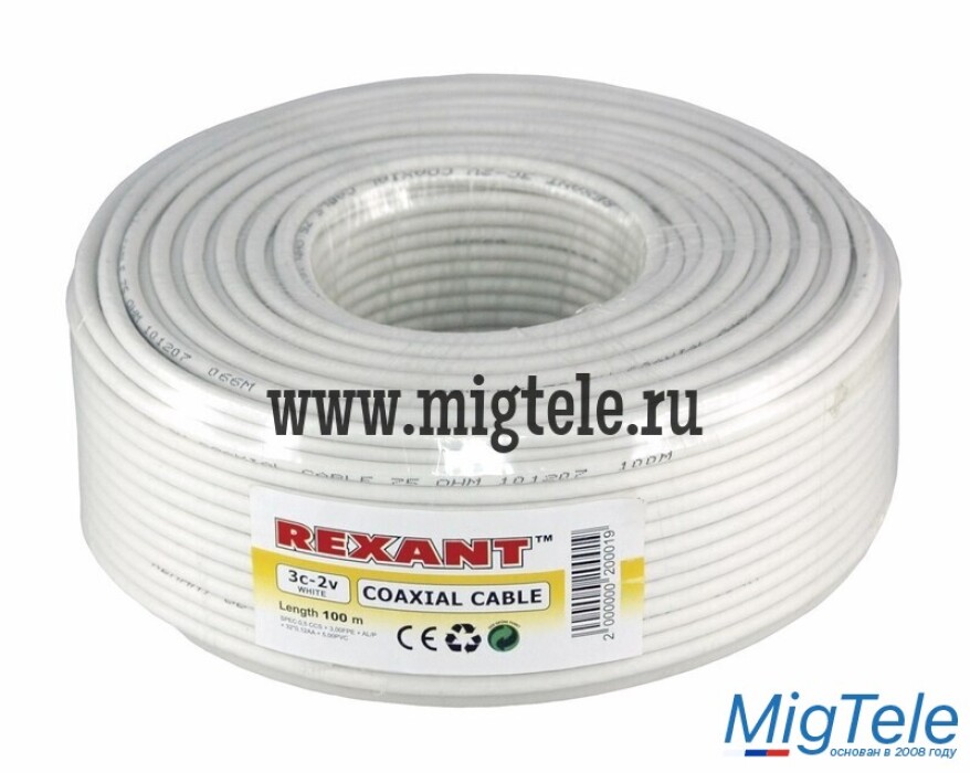 Кабель 3С-2V (75 Ом), CCS/Al/Al 48 % (бухта 100 м) белый REXANT коаксиальный радиочастотный со вспененной полиэтиленовой изоляцией и в ПВХ оболочке. Является самым распространенным решением для подключения внутренних и межблочных соединений общепромышленных и бытовых радиотехнических устройств, для подключения систем телевидения, а также для подключения видеокамер наружного и внутреннего наблюдения.