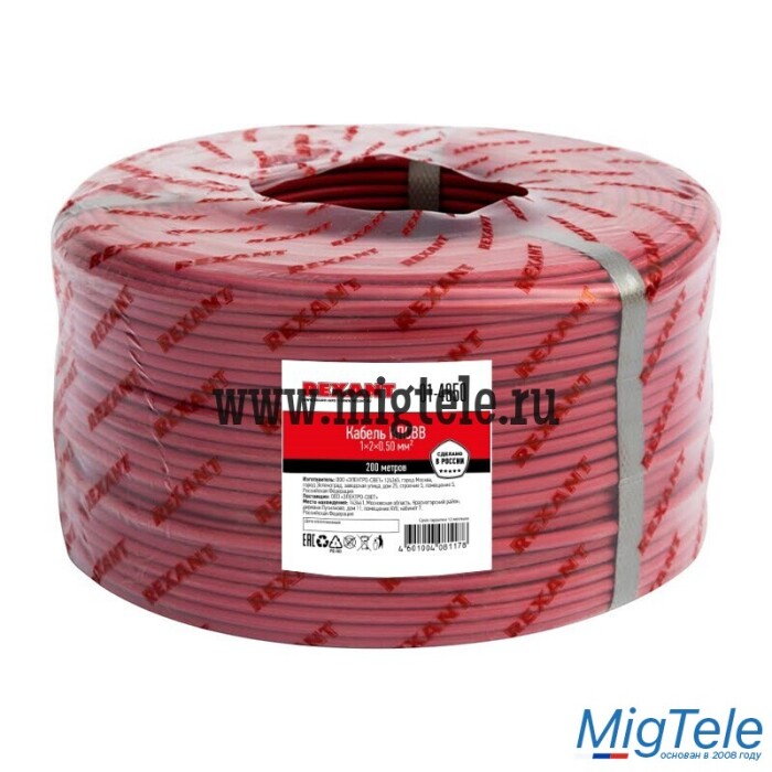 Rexant 01-4850 Кабель для пожарной сигнализации КПСВВ 1x2x0,50мм