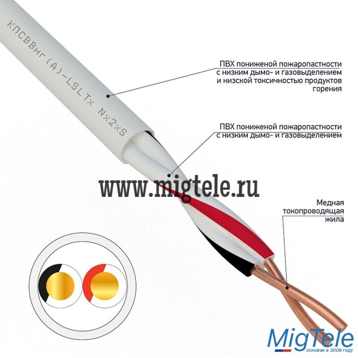 Оболочка: поливинилхлоридный пластикат пониженной пожароопасности с низким дымо- и газовыделением и низкой токсичностью продуктов горения