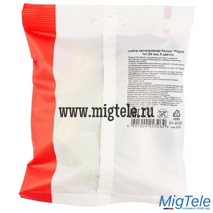 Набор автопровода REXANT «Радуга» 1х1,50 мм, 6 цветов (белый, желтый, зеленый, красный, синий, черный) по 3 метра