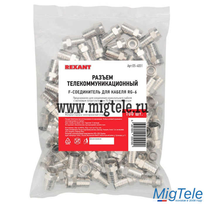 РАЗЪЕМ F-разъем RG-6 обжим REXANT предназначен для соединения коаксиального кабеля волновым сопротивлением 75 Ом с телевизионным и видеооборудованием (ресиверы, телевизоры, всевозможная видеоаппаратура и т.д.). F-коннектор изготовлен из никелированного сплава меди (биметалл). Разъем устанавливается на кабель обжатием после соответствующей зачистки контактов с помощью специального обжимного инструмента. При обжатии разъема втулка равномерно зажимает кабель по окружности. F-штекер выступает в роли своеобразного экрана за счет обжатия на оплетке кабеля для выполнения роли электрического контакта. Такой высокочастотный соединитель имеет ряд положительных преимуществ: