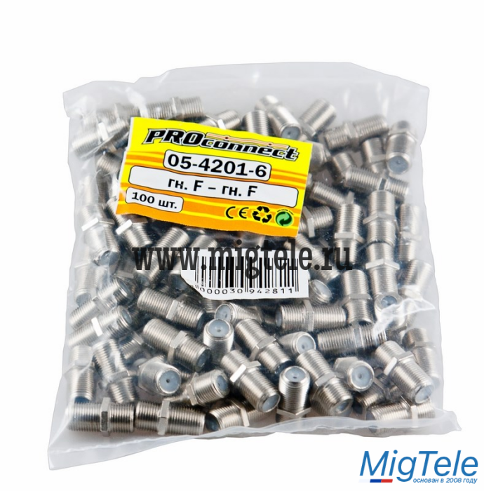 ПЕРЕХОД гнездо F - гнездо F "БОЧКА" без кольца PROconnect предназначен для соединения двух частей коаксиального кабеля волновым сопротивлением 50 или 75 Ом, на концах которых расположены штекеры F-разъема. Применяется главным образом для подключения эфирного, кабельного и спутникового телевидения к телевизионному оборудованию. В частности, он позволяет увеличить длину антенного кабеля или соединить поврежденный участок. Изготовлен переход из никелированного сплава первичной меди (биметалл), что обеспечит долговечность соединения и возможность применять его в условиях климатических перепадов. Разъем соединяет кабель методом накрутки F-коннектора с обеих сторон после соответствующей зачистки контактов и не требует в ходе монтажа применения каких-либо специальных инструментов. Такой высокочастотный соединитель имеет ряд положительных преимуществ: