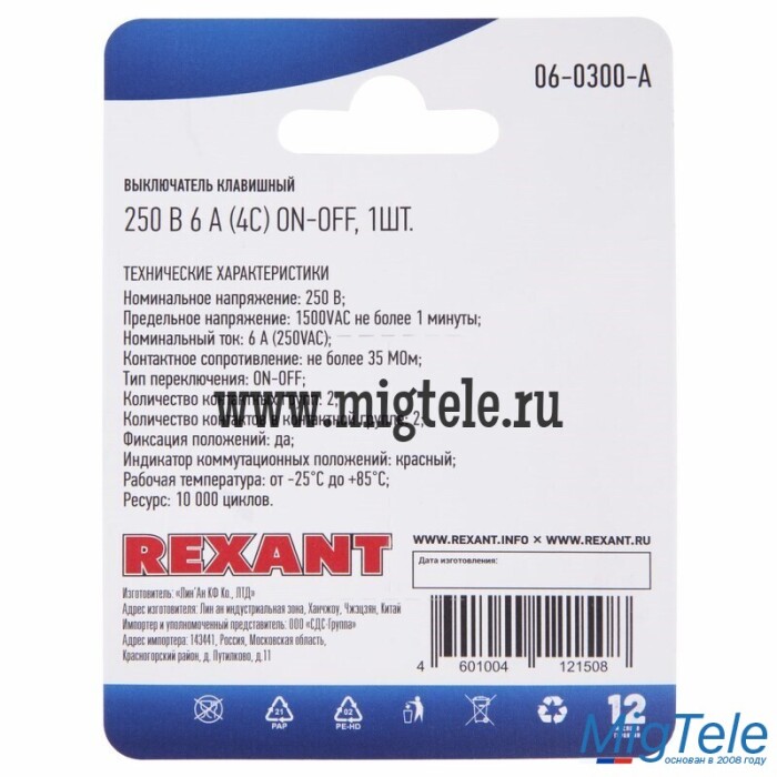 Rexant 06-0300-A Выключатель клавишный 250V 6А (4с)