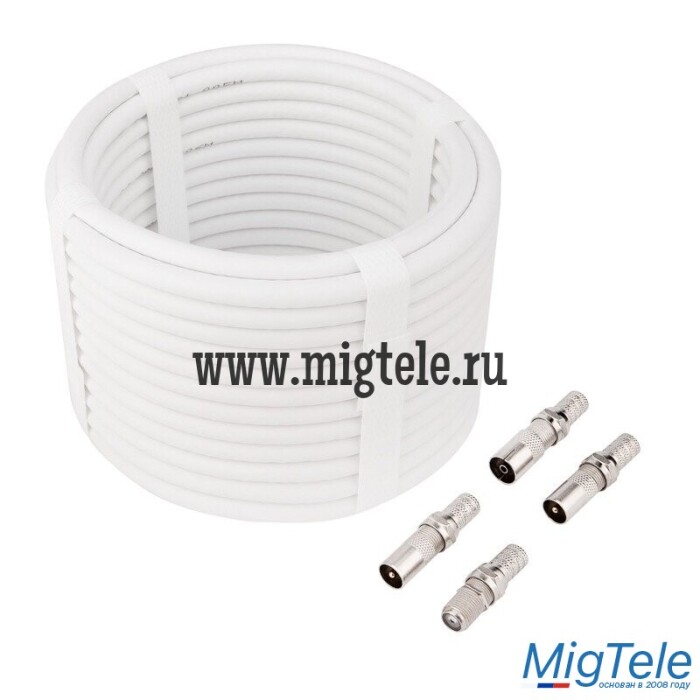 В состав комплекта входят: кабель RG-6 CCS 75Ом длиной 10 метров; F-разъем RG-6 – 4 шт; переходник (гнездо F - штекер TV) – 2 шт; переходник (гнездо F - гнездо TV) – 1 шт; переходник (гнездо F - гнездо F Бочка) – 1 шт.