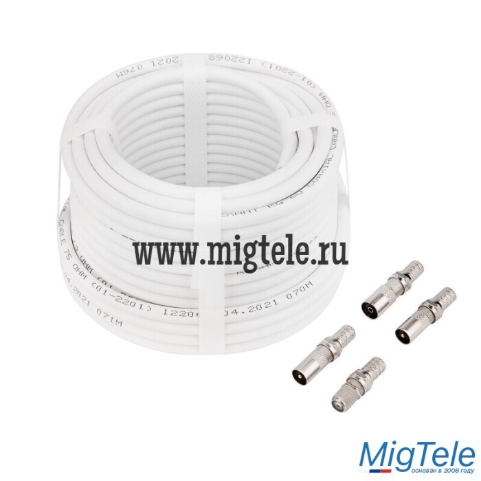 В состав комплекта входят: кабель RG-6 CCS 75Ом длиной 15 метров; F-разъем RG-6 – 4 шт; переходник (гнездо F - штекер TV) – 2 шт; переходник (гнездо F - гнездо TV) – 1 шт; переходник (гнездо F - гнездо F Бочка) – 1 шт.