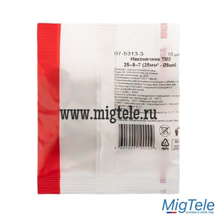 Описание Rexant 07-5313-3 Наконечник медный луженый ТМЛ 25–8–7