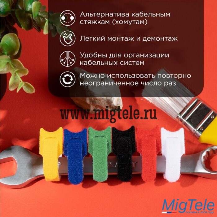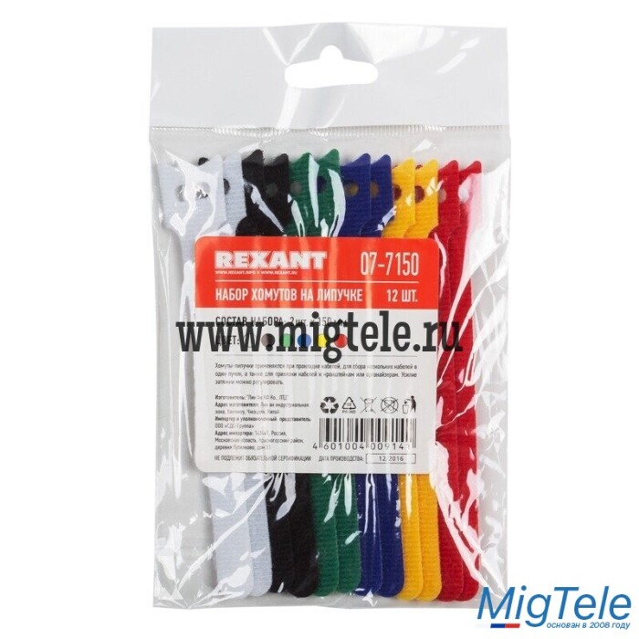 В упаковке поставляются 12 хомутов на липучке размером 150х12мм белого, черного, зеленого, синего, желтого, красного цветов (по 2 шт). Это особенно удобно для маркировки проводов.