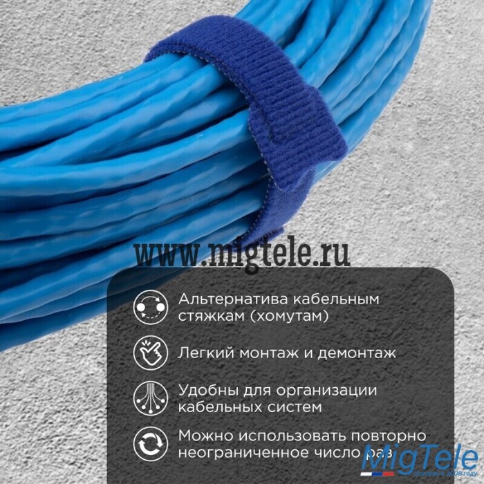 В упаковке поставляются 12 хомутов на липучке размером 230х13мм синего цвета. Их мягкая текстура исключает риск повреждений и перетяжки кабельных жгутов.