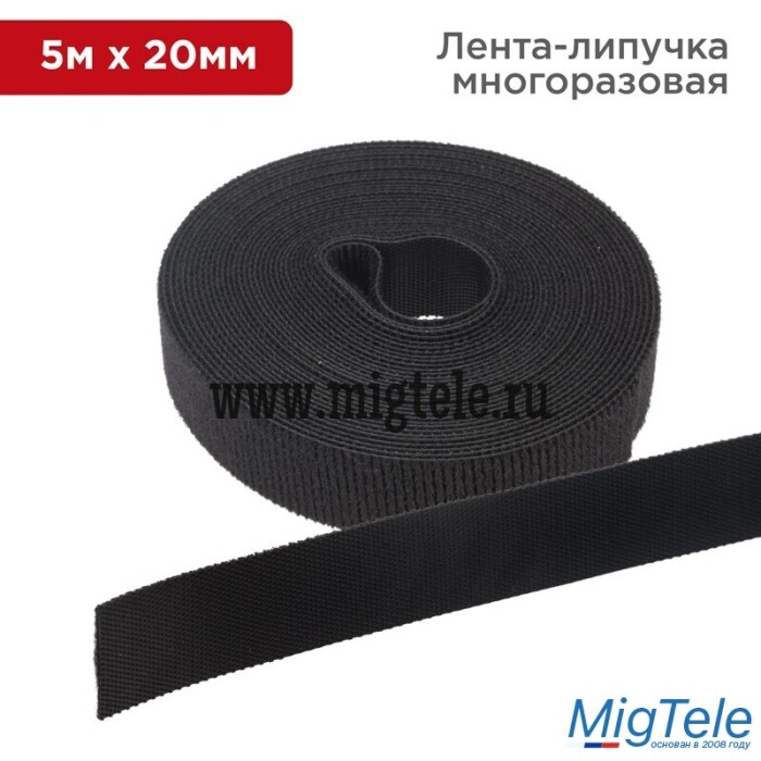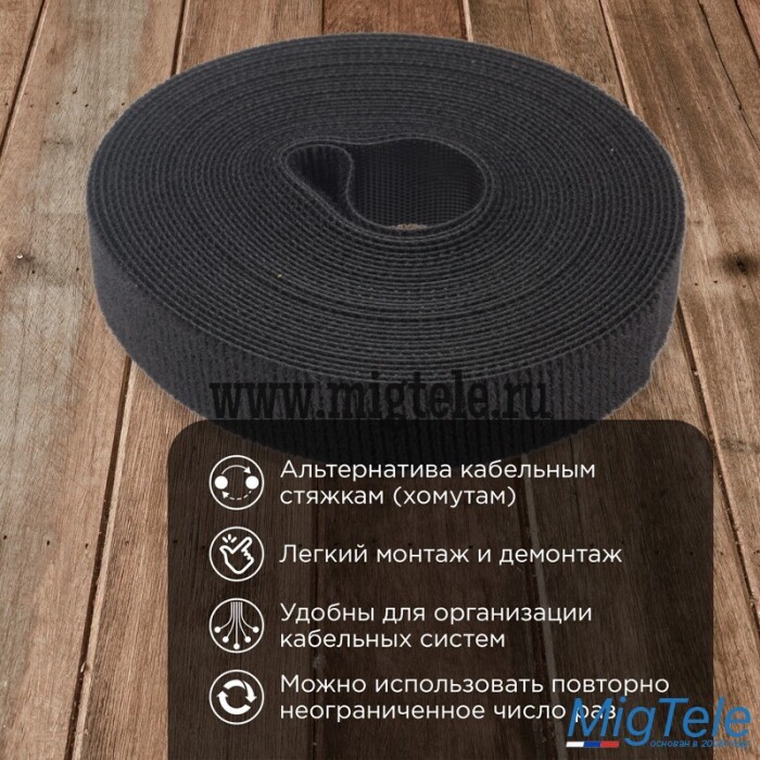 Лента размером 5 м х 20 мм черного цвета представляет собой нейлоновую полосу с крючками с одной стороны и петельками с другой. Такая конструкция стяжки позволяет эксплуатировать ее многократно: отстегивать и застегивать по мере необходимости. Петли и крючки расположены по всей длине ленты, благодаря чему ее можно использовать в любом направлении.