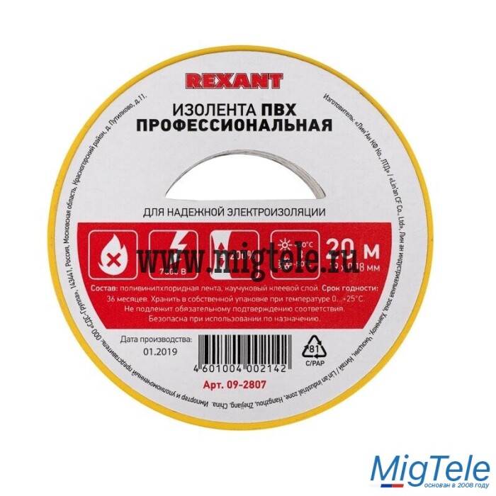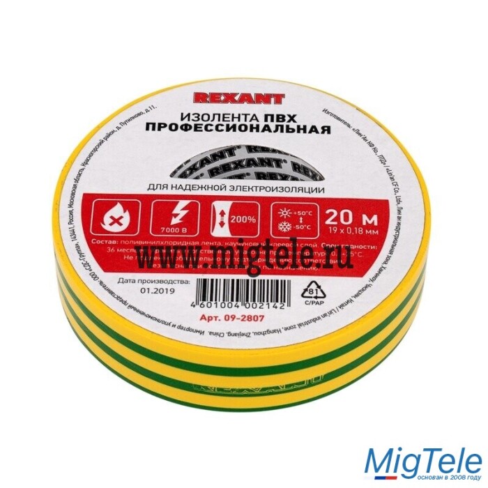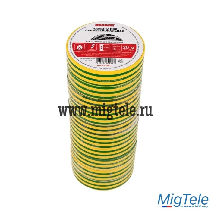Описание Rexant 09-2807 Изолента ПВХ 0,18х19 мм х 20 м