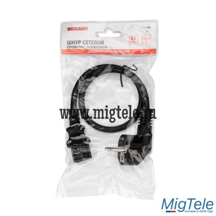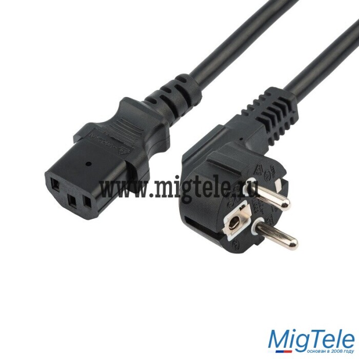 Данный шнур IEC оснащен с одной стороны неразборной литой вилкой (евростандарт) с заземляющим контактом, с другой — литым трехконтактным гнездовым разъемом C13 и трехжильным проводом с сечением жил 1,5 мм².