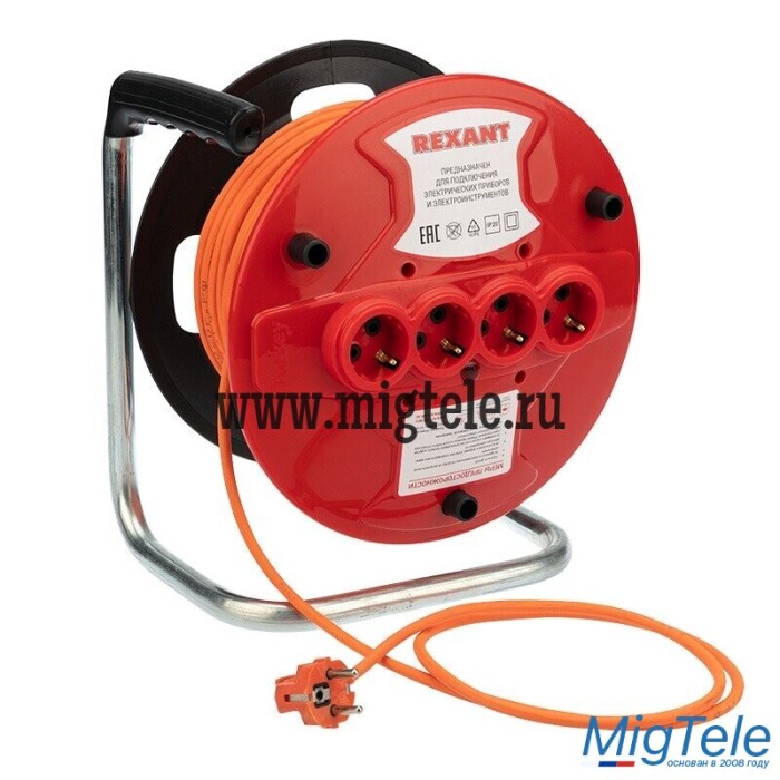 Шнур-удлинитель на катушке REXANT с 4 гнездами предназначен для подключения электрических приборов и электроинструмента, когда недостаточно стандартной длины шнура для питания от стационарных розеток.