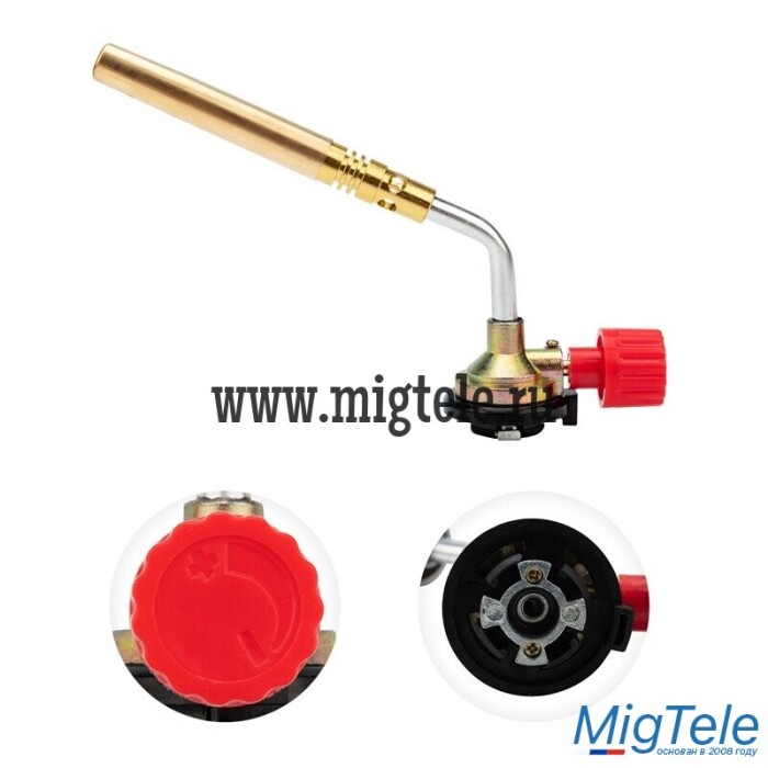 Модель отличается узким соплом паяльного типа. Благодаря этому удобно проводить точечные и паяльные работы, удобнее использовать для резки труб и металлов, применять в ювелирной отрасли. Уровень пламени регулируется с помощью вентиля.