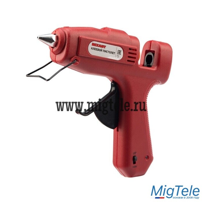 Пистолет клеевой REXANT (100 Вт, Ø11 мм) предназначен для прочной фиксации поверхностей с помощью расплавленной клеевой массы.
