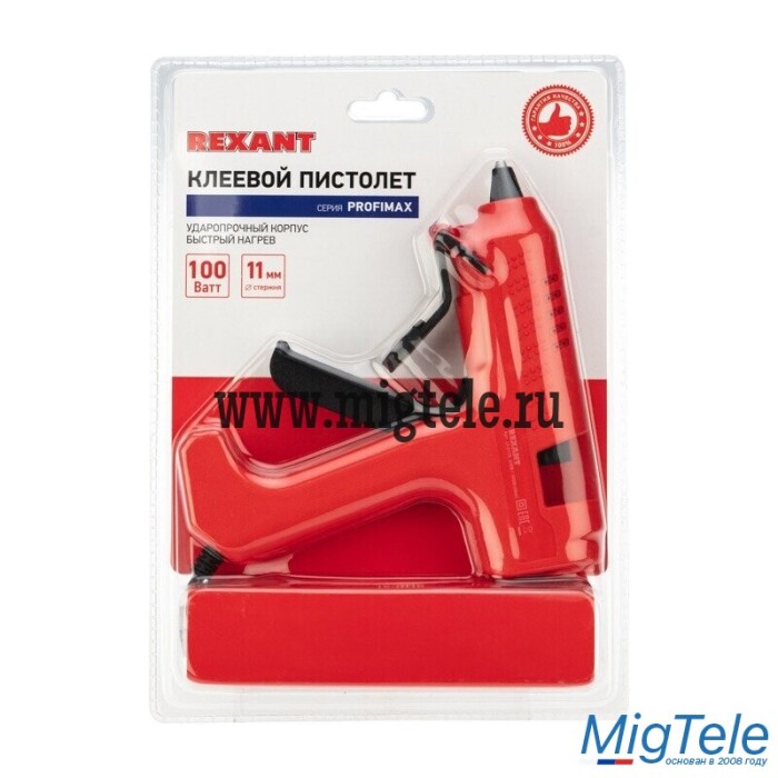 Пистолет клеевой REXANT (100 Вт, Ø11 мм, ProfiMax) предназначен для прочной фиксации поверхностей с помощью расплавленной клеевой массы.
