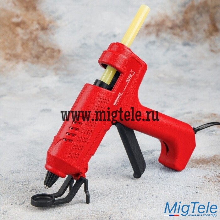 Корпус клеевого пистолета изготовлен из ударопрочной пластмассы и имеет скобу для установки в режиме ожидания.