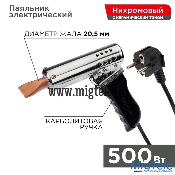 Паяльник-пистолет высокомощный, серия ЭПСН, мощность 500 Вт REXANT. Предназначен для ручной пайки металлических изделий или листов средней и более толщины, а также для лужения крупных проводов или кабельных наконечников. Подходит как для любительского, так и для профессионального использования.
