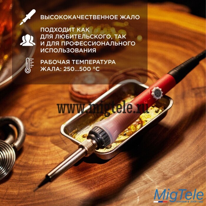 Керамический нагреватель обеспечит быстрый прогрев жала и длительный срок службы паяльника. Прибор оснащен ударопрочной рукояткой из термостойкого пластика с резиновой накладкой, которая сделает работу с инструментом легкой и приятной.