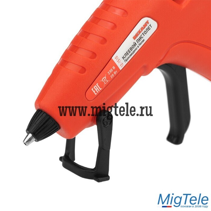 Пистолет клеевой REXANT (20 Вт, Ø7 мм, «ЭКСПЕРТ») предназначен для прочной фиксации поверхностей с помощью расплавленной клеевой массы.