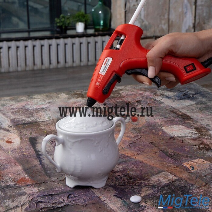 Принцип работы: клеевой стержень плавится в металлической камере с помощью нагревательного устройства и для точного дозированного нанесения при нажатии на курок подается из сопла на склеиваемую поверхность. Используется в моделировании, рукоделии, при выполнении мелкого ремонта, для изготовления упаковочной и сувенирной продукции, монтажа электрических плат, декорирования, и т.п.