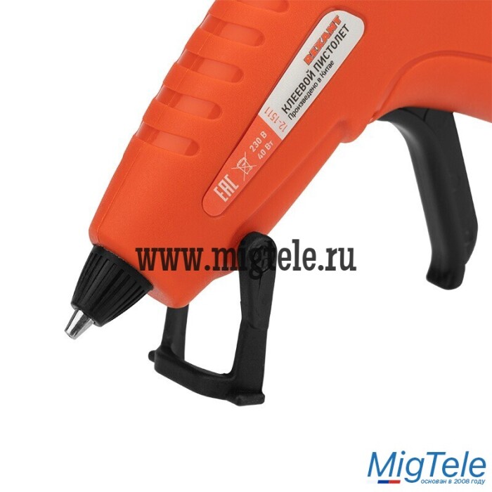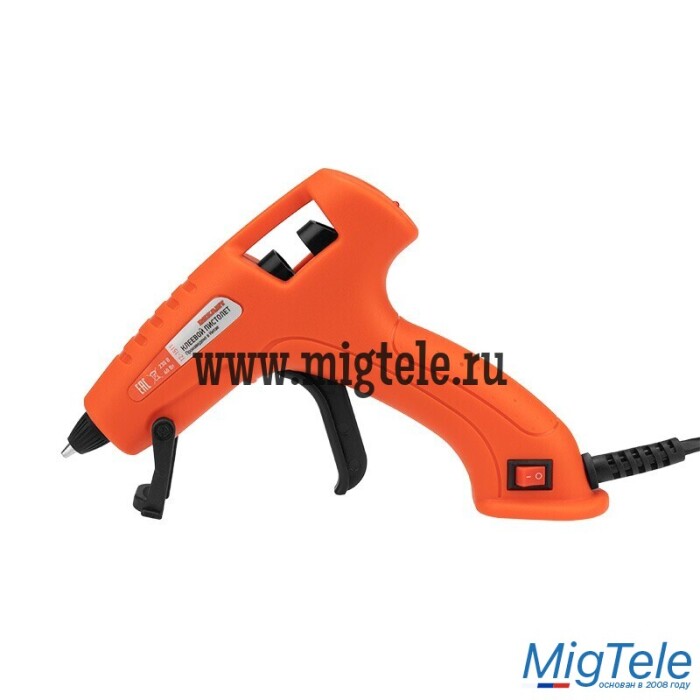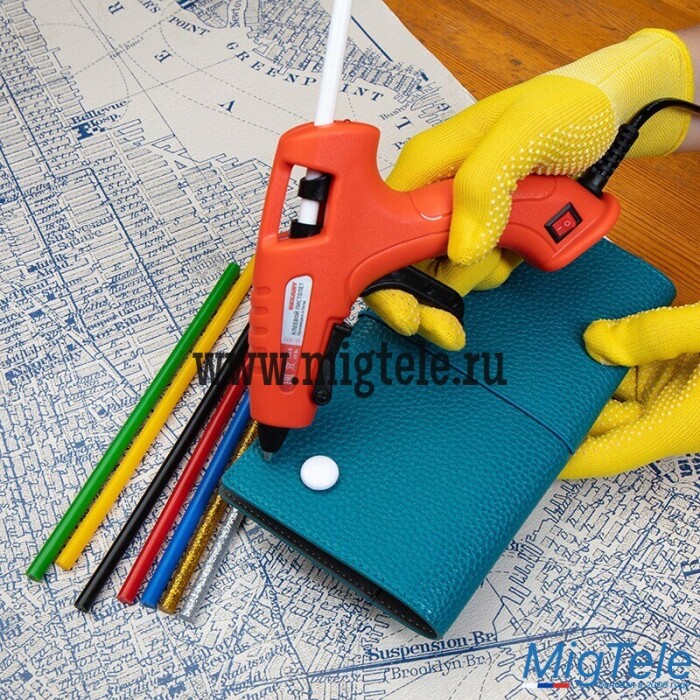 Принцип работы: клеевой стержень плавится в металлической камере с помощью нагревательного устройства и для точного дозированного нанесения при нажатии на курок подается из сопла на склеиваемую поверхность. Используется в моделировании, рукоделии, при выполнении мелкого ремонта, для изготовления упаковочной и сувенирной продукции, монтажа электрических плат, декорирования, и т.п.