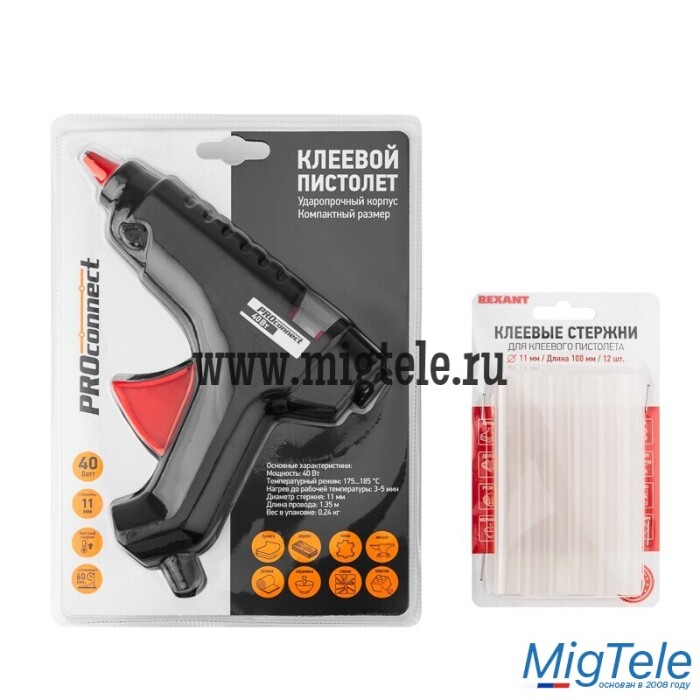 Агрегат заряжается клеевыми стержнями диаметром 11 мм. В комплекте предусмотрены соответствующие стержни длиной 100 мм с прозрачной основой (в упаковке 12 шт). Термоклей не требует особых навыков в использовании, состоит их нетоксичных материалов. Застывание длится не более 1 минуты.