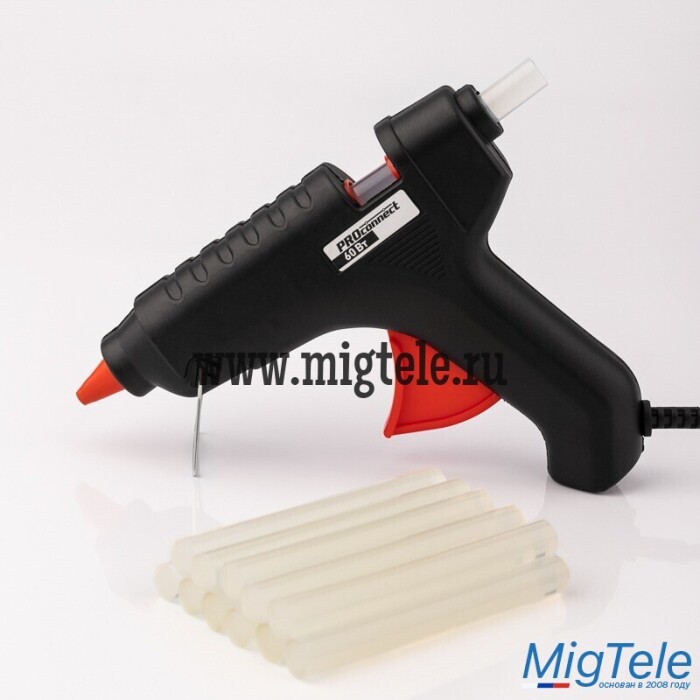 Высокомощный клеевой пистолет мощностью 60 Вт используется для прочной фиксации поверхностей с помощью расплавленной клеевой массы, применяется как в профессиональной области, так и в быту для создания элементов декора. Совместим практически с любыми материалами: деревом, пластиком, резиной, кожей, стеклом, металлами (их лучше перед работой разогревать феном), тканью, пенопластом, керамикой, картоном, бумагой, цветами и т.п. При включении прибора в электросеть 220 В патроны начинают разогреваться до температуры 175℃-185℃ и плавиться. Точное дозирование достигается за счет нажатий на курок. Склеенными предметами можно пользоваться в среднем уже через 10 минут. Ударопрочный корпус оснащен скобой для фиксации инструмента на горизонтальных поверхностях. Высокая производительность 9-11 г/мин позволяет отнести пистолет к экономичному инструменту, который справляется с широким спектром задач.