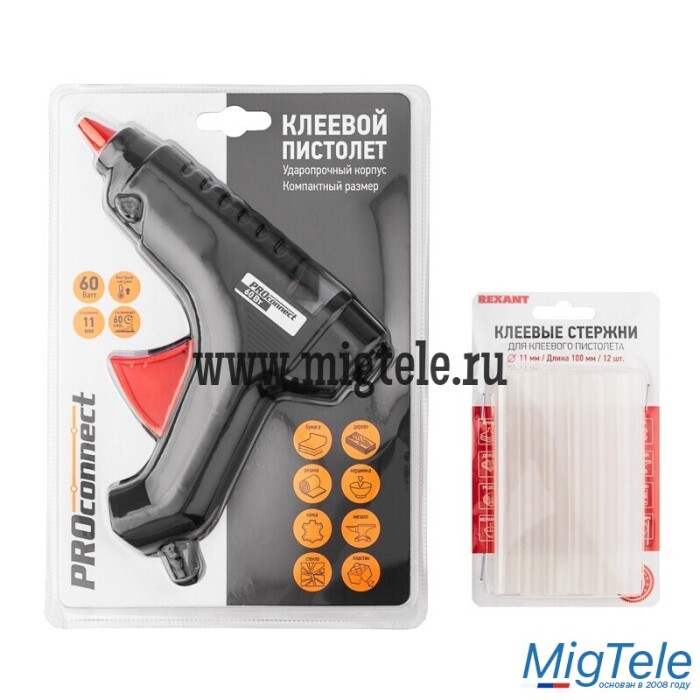 Агрегат заряжается клеевыми стержнями диаметром 11 мм. В комплекте предусмотрены соответствующие стержни длиной 100 мм с прозрачной основой (в упаковке 12 шт). Термоклей не требует особых навыков в использовании, состоит их нетоксичных материалов. Застывание длится не более 1 минуты.